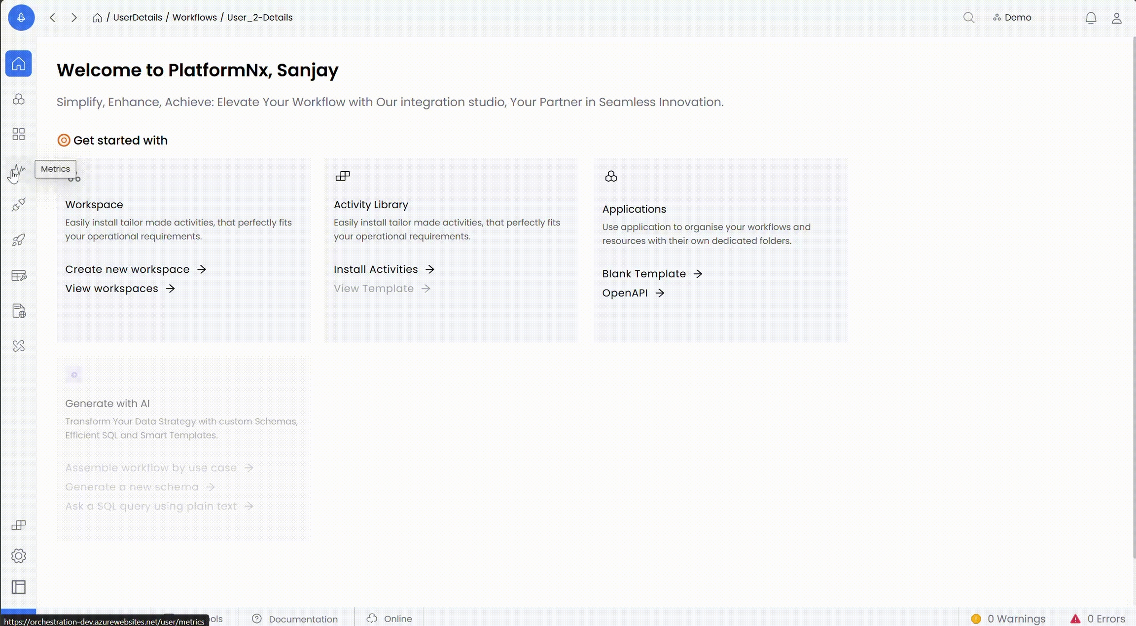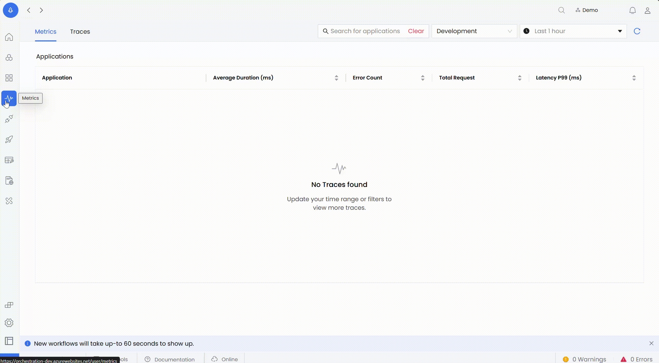 The Metrics Dashboard provides a centralized interface for monitoring and analyzing workflow executions and traces. It offers an aggregated view of execution metrics, including total requests, average duration, error counts, and latency percentiles. This tool enables users to ensure operational efficiency and traceability at the application, workflow, and execution levels through advanced visualizations and actionable insights.