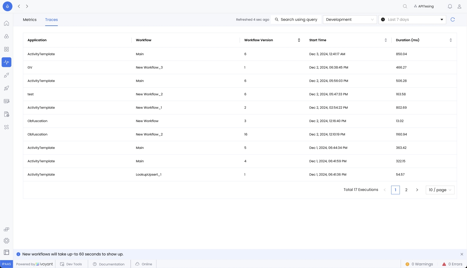PlatformNX allows users to search and filter traces for deeper insights into workflow execution and performance.